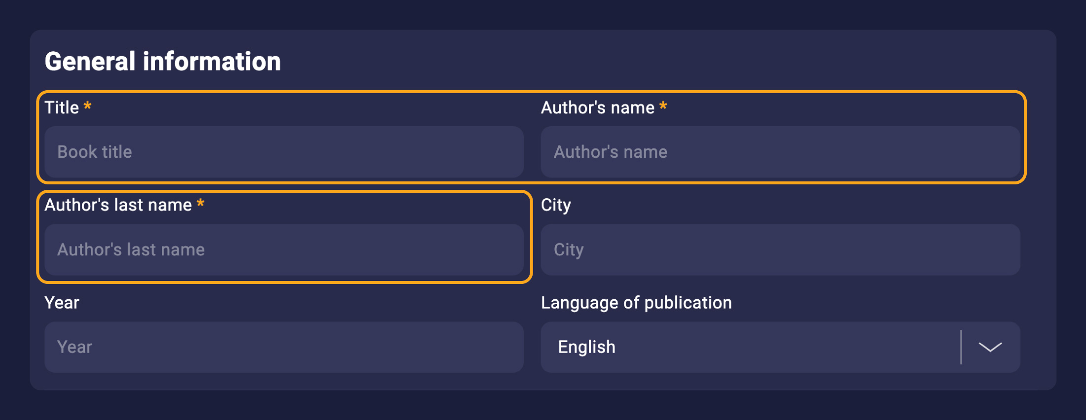 Step 1. General information about the project Mandatory fields to be filled in: The book heading, Author's last and first names.